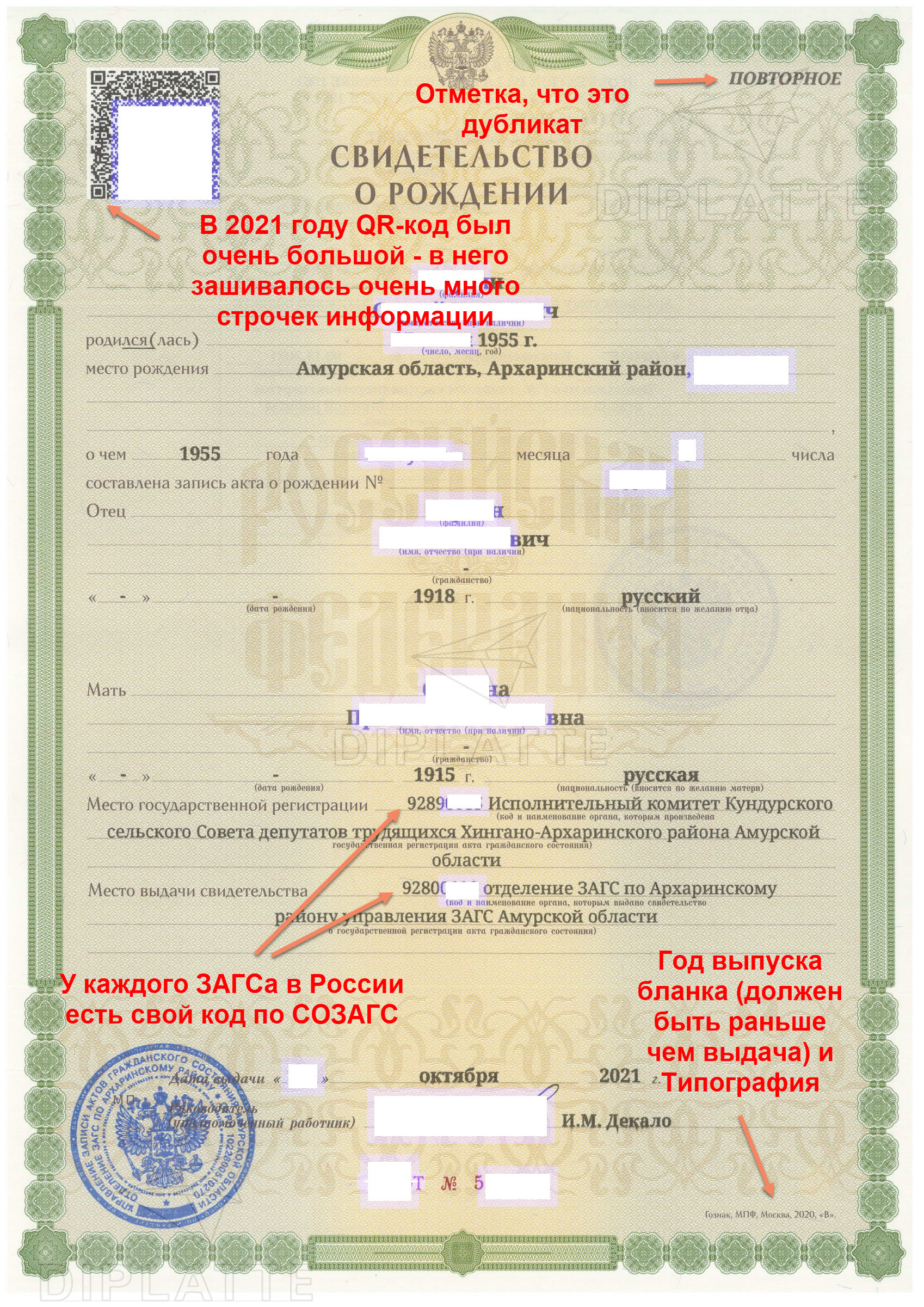 Причём в разных ЗАГСах этот набор данных может варьироваться. Нет строгого регламента по виду данных «зашитых» в QR-коде. Также QR-коды 2021 года были намного длиннее, чем сегодняшние (2025 года). Оцените: